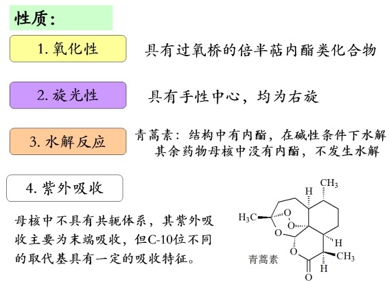 青蒿素类药物的分子具有过氧桥的倍半萜内酯化学结构特征,具有氧化性、旋光性、水解性、紫外吸收等理化性质。