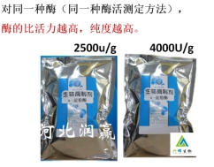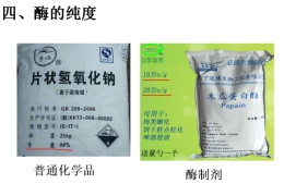 让学生观察普通化学品和酶制剂商品包装图片,现场点名提问,找出纯度表示方法的差异。