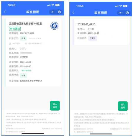 借用日期选择、编号填写完成后提交查询。如教室已审批完成,状态为批准,将显示借用详细信息。如状态显示为待审批,可耐心等待,或通过下方电话联系教务老师完成网上审批。