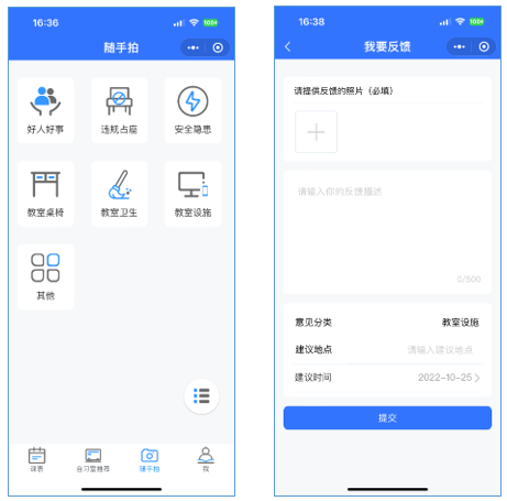 为加强公共教室的管理,规范教室秩序,小程序推出随手拍功能。学生可以将日常学习过程中遇到的教室设施、教室卫生、违规占座等问题通过手机拍照的方式记录,分类别将图片、地点、事件等描述清楚提交,我们将及时反馈给教室管理相关部门。请各位同学提高责任意识,如实反映问题,共同营造安全有序的学习环境。
