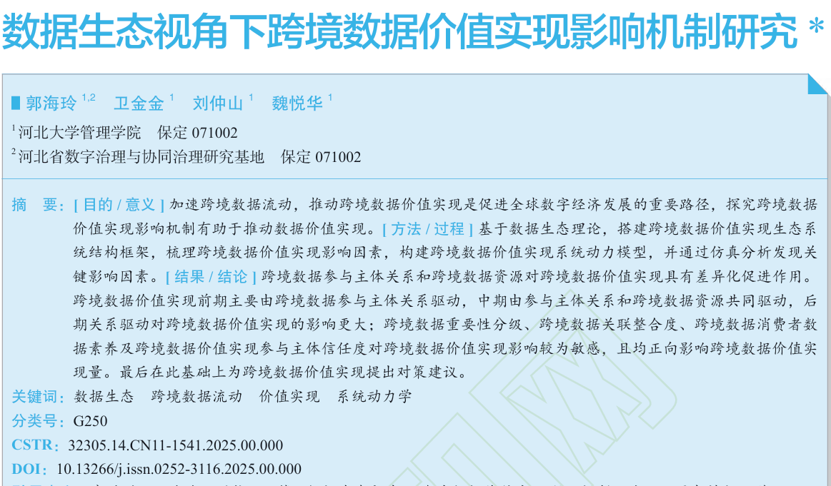 近日,管理学院郭海玲教授与其博士生卫金金的研究成果“数据生态视角下跨境数据价值实现影响机制研究”被信息资源管理领域的国内权威期刊《图书情报工作》录用并在线发表。