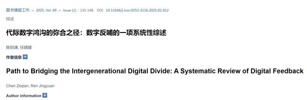 近日,我院陈则谦教授的研究成果“代际数字鸿沟的弥合之径:数字反哺的一项系统性综述”被信息资源管理领域的国内权威期刊《图书情报工作》录用并在线发表。陈则谦老师为论文第一作者,其博士生任婧媛为通信作者。《图书情报工作》创刊于1956年,主要报道信息资源管理学科领域及相关领域理论和实践的最新研究与实践进展。该期刊被中国社会科学评价研究院AMI综合评价评为A刊权威期刊、被武汉大学中国科学评价研究中心RCCSE评为中国权威学术期刊(A+),(2024版)复合影响因子为4.0,(2024版)综合影响因子为3.185。