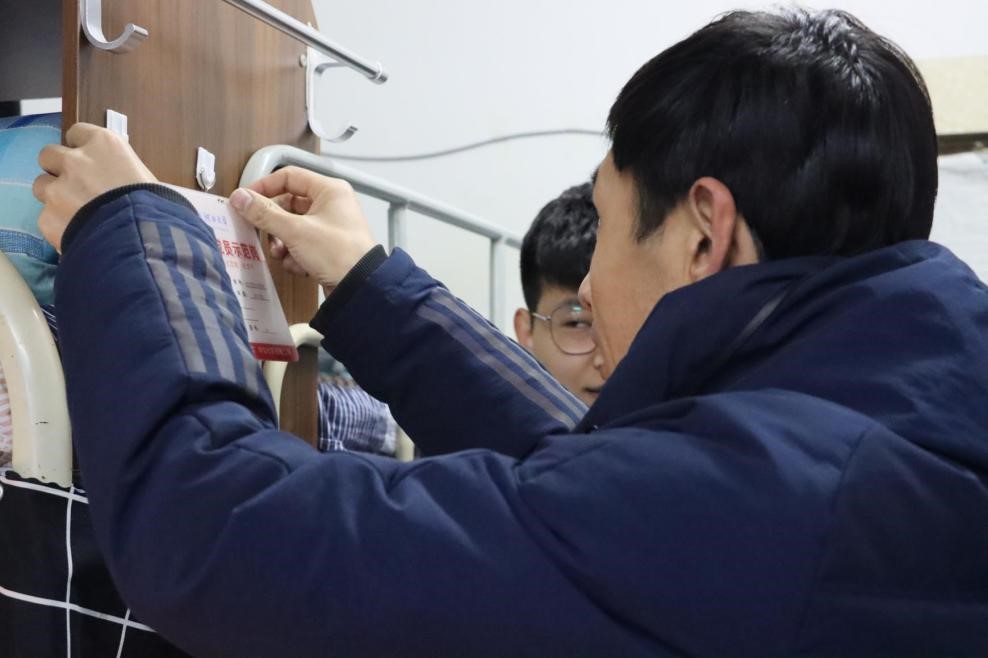 12月15日,马辉书记和团委老师们走进党员宿舍,走近学生生活。同学生党员进行了亲切交谈,并为他们将“学生社区党员示范岗”标志牌悬挂于床边,强调了党员在学生群体中的引领作用,对他们今后应当如何更好地发挥党员的先锋模范作用进行了要求和嘱托,使各位党员内心责任感和使命感得以增强。在挂牌工作完成后,我院园区办工作人员对党员挂牌情况进行验收,规范了标志牌的挂置方式和位置。