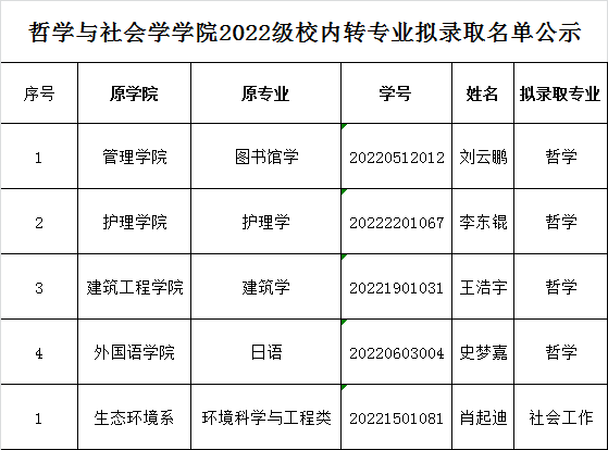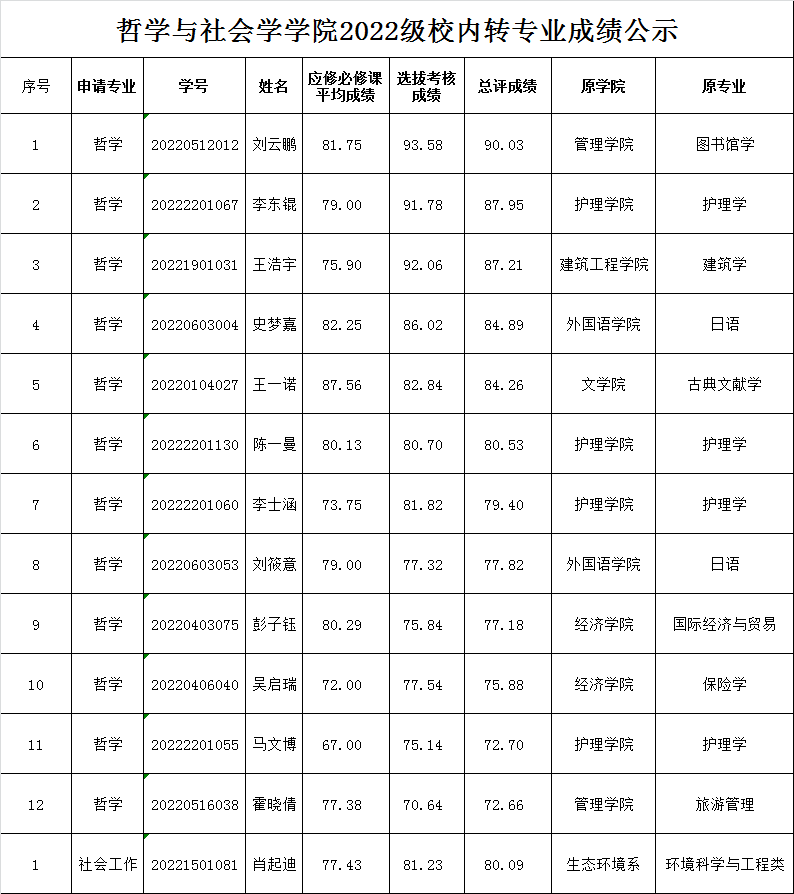 哲学与社会学学院2022级校内转专业成绩及拟录取学生名单公示