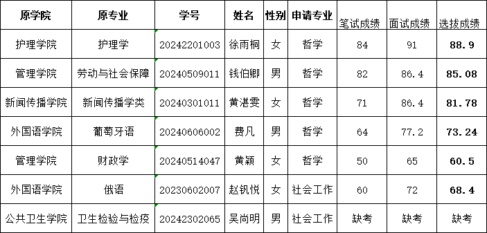 哲学与社会学学院于2025年2月26日上午组织2024级转专业学生笔试和面试,成绩统计如下,公示期