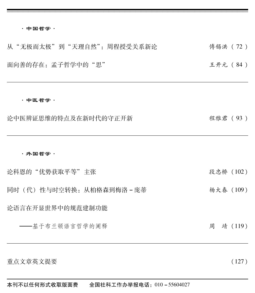 近日,哲学与社会学学院哲学系王开元博士以独立作者在顶级期刊《哲学研究》2021年第5期发表了题为《面向善的存在:孟子哲学中的“思”》的研究论文,分析了孟子哲学中“思”所具有的认识论、工夫论与道德主体建构等三重意蕴。《哲学研究》由中国社会科学院主办,是哲学类专业顶级期刊,并属CSSCI与北大中文核心来源期刊。