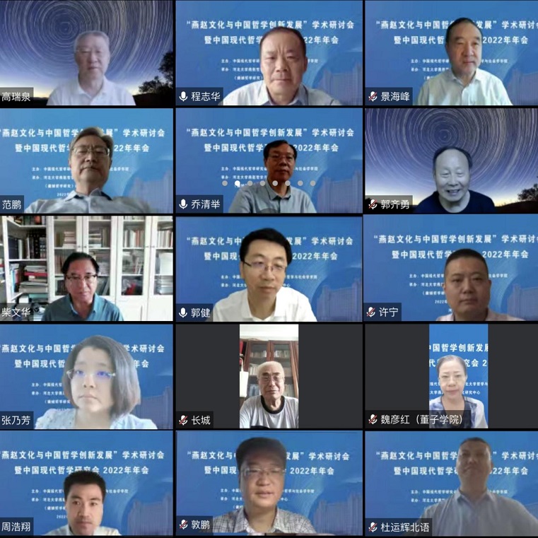 813-14日,由中国现代哲学研究会和我院联合主办,我院燕赵哲学与文化研究中心、《畿辅哲学研究》编辑部承办的“燕赵文化与中国哲学创新发展”学术研讨会暨中国现代哲学研究会2022年年会如期举行。来自中央党校、清华大学、武汉大学、中山大学、深圳大学、山东大学、华东师范大学、河北师范大学、衡水学院等省内外40多所高校和科研机构的80多名专家学者参加会议,我院全体在读博士生、博士后和中国哲学、外国哲学、伦理学专业的硕士生参与聆听了会议。会议开幕式由我院院长程志华教授主持。因疫情防控需要,会议全程为线上形式召开。