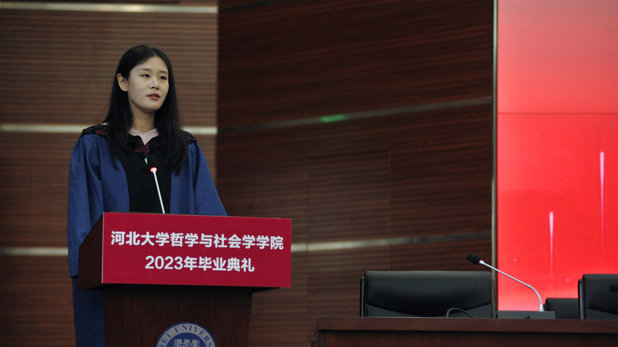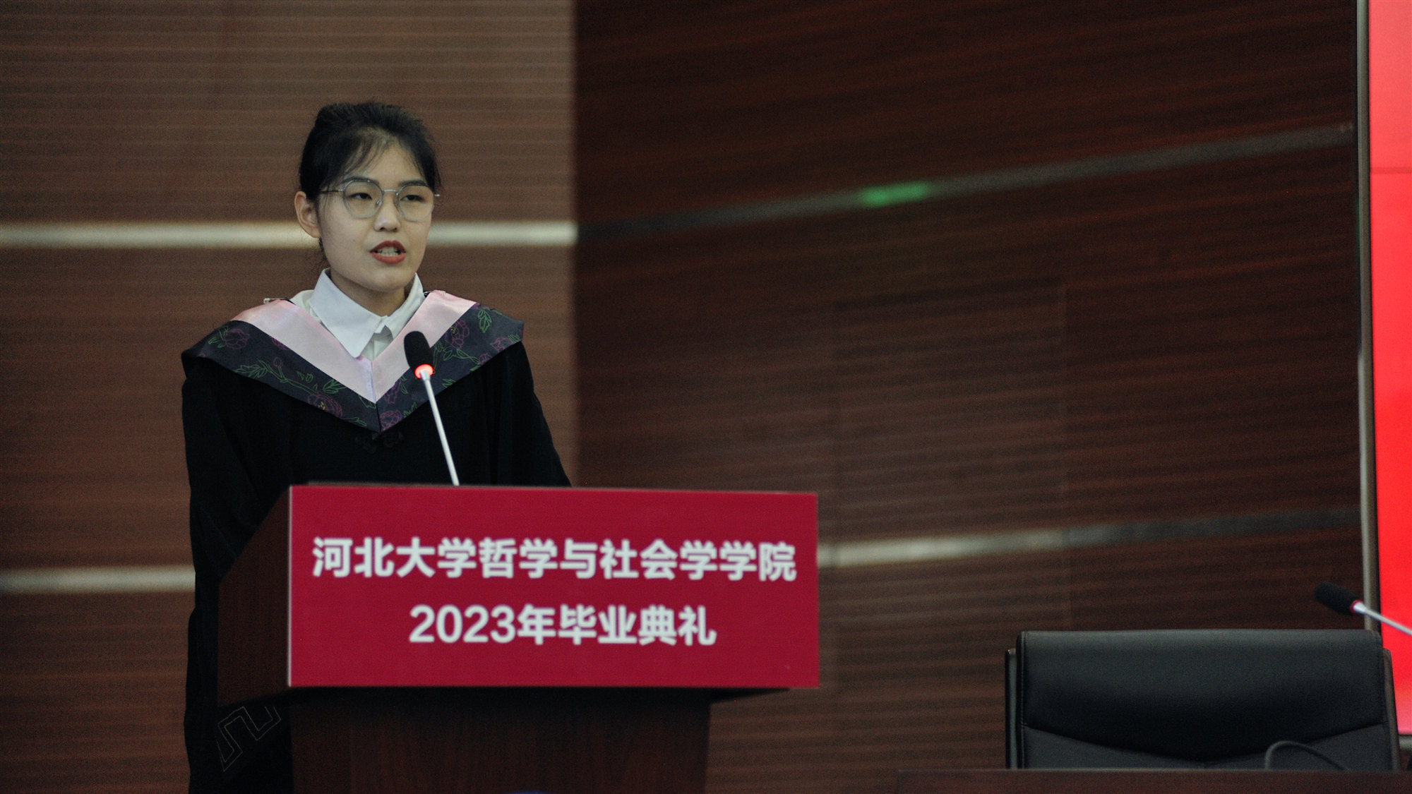 “学思奖学金”一等奖获得者2019级社会工作专业孙晓蕾、2020级中国哲学专业周漪宁分别代表毕业生发言。她们回顾了大学美好时光,表达了对母校、学院、教师、同学的感恩及祝福。并表示在未来的道路上,他们会坚定理想信念,牢记“实事求是”的校训,传承河大精神,继续砥砺前行,为母校争光,为祖国发展和文明进步贡献自己的力量。