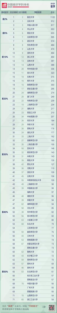 2020年10月15日,高等教育评价专业机构软科发布“2020软科中国最好学科排名”,排名榜单包括96个一级学科。其中,我院哲学学科在全国哲学学科排名49位,位列前40%,比2019年提升9个名次。排名的提升反映出我院哲学学科快速发展的良好势头。(完整排名名单见图)