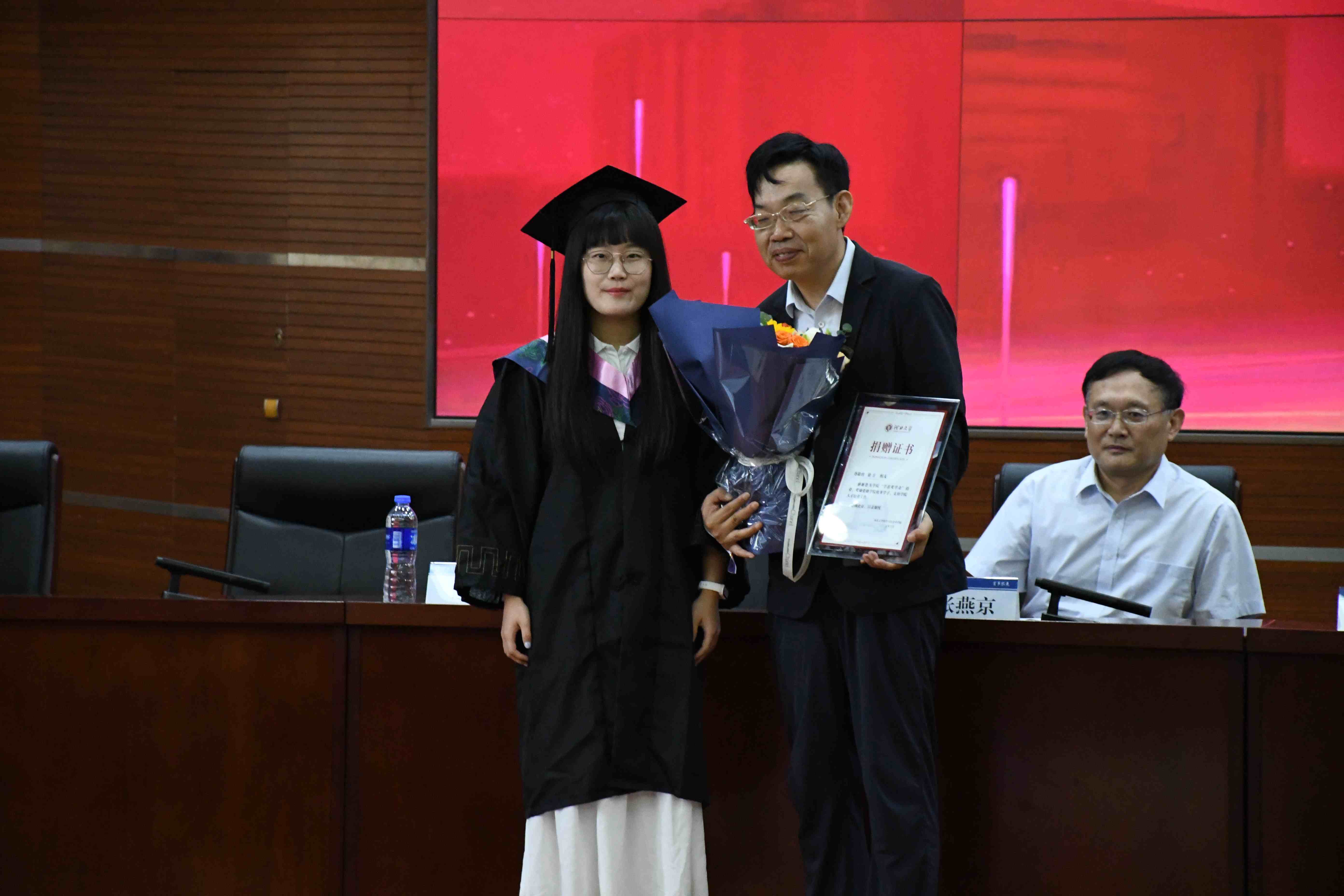 河北大学党委常委、副校长宋凤轩等分别为“学思奖学金”获奖同学颁奖。学院院长张燕京为本年度接续助力“学思奖学金”的捐赠人,我院90级校友、河北兴冀律师事务所主任徐方先生颁发捐赠证书。“学思奖学金”历年获奖同学代表也献上视频致谢及真挚祝福。