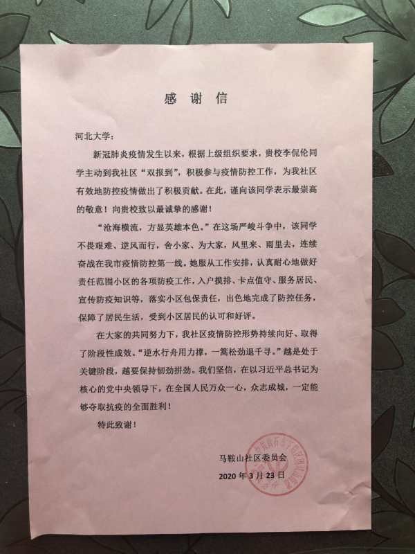 “沧海横流,方显英雄本色。”在这场严峻的斗争中,李侃伦同学始终坚守在自己的岗位上,出色地完成各项防疫工作,彰显了新时代青年的责任与担当,获得了小区居民的一致认可和好评。马鞍山社区也于近日为我校寄来了感谢信,在信中高度赞扬了李侃伦同学为社区防疫工作所做的贡献。