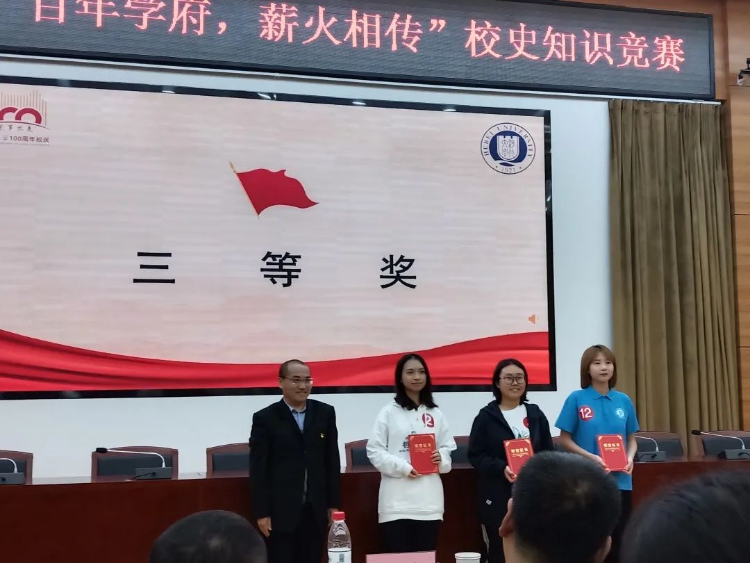 为赓续百年校史,献礼河大校庆,河北大学举办“百年河大,薪火相传”校史知识竞赛。10月7日下午3点,校史决赛在河北大学本部主楼304报告厅举行。由2020级社会工作专业张佳静、高楚桐同学,2020级哲学专业张楠同学组成的“知行小队”,代表哲学与社会学学院参加决赛。