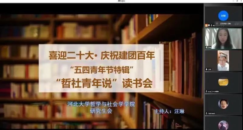 5月4日晚,我院 “哲社青年说” 第一期读书会以线上方式开启,本期读书会主题为“悟经典、品哲学、得新知”。学院团委书记王昭、专职辅导员尹清华,及本硕同学代表参加了本次活动。