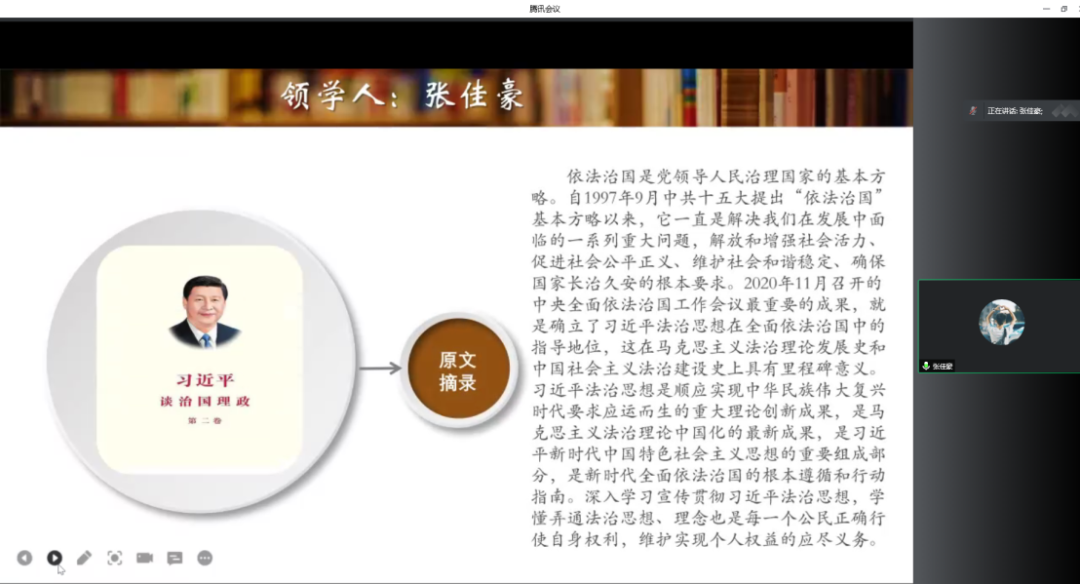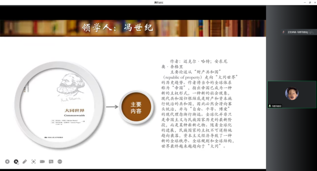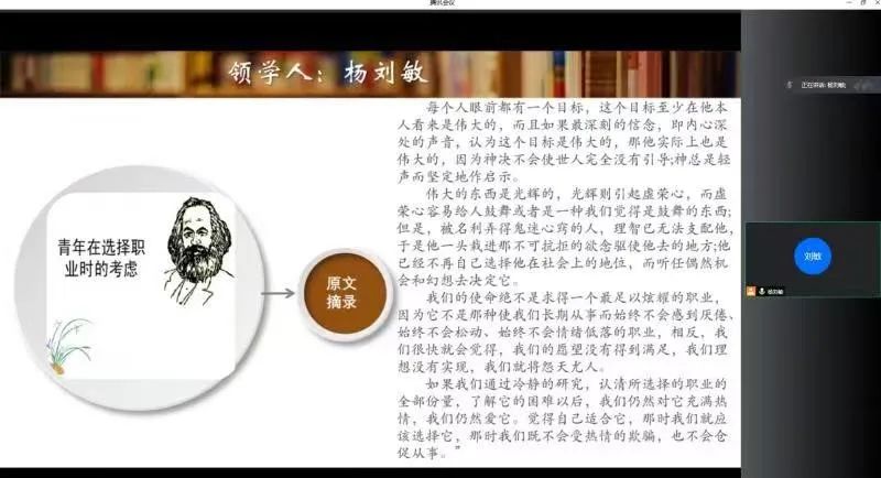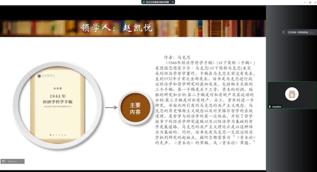 冯世纪同学从全球化的角度解读了国外研究马克思的著作《大同世界》。赵凯悦同学从共产主义的角度分享了她对于《1844年经济学哲学手稿》的读书体会。李珍珍同学从《诗经》《孟子》中与同学们分享了古人的哲学智慧。杨刘敏同学从青年职业选择的角度分享了马克思《青年在选择职业时的考虑》一文。张佳豪同学分享了他对《习近平谈治国理政》中法治思想的学习感悟。