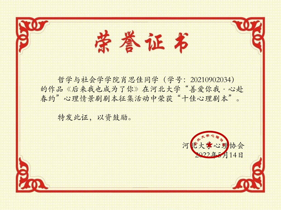 河北大学心理情景剧大赛是学校大学生心理健康教育工作中的亮点活动之一,在今年的“善爱你我,心赴春约”心理情景剧剧本征集活动中,我院充分动员、积极组织、精心指导,学生踊跃参与,21哲学班肖思佳作品《心中下过的一场雪》脱颖而出,喜获“河北大学十佳心理剧本”。