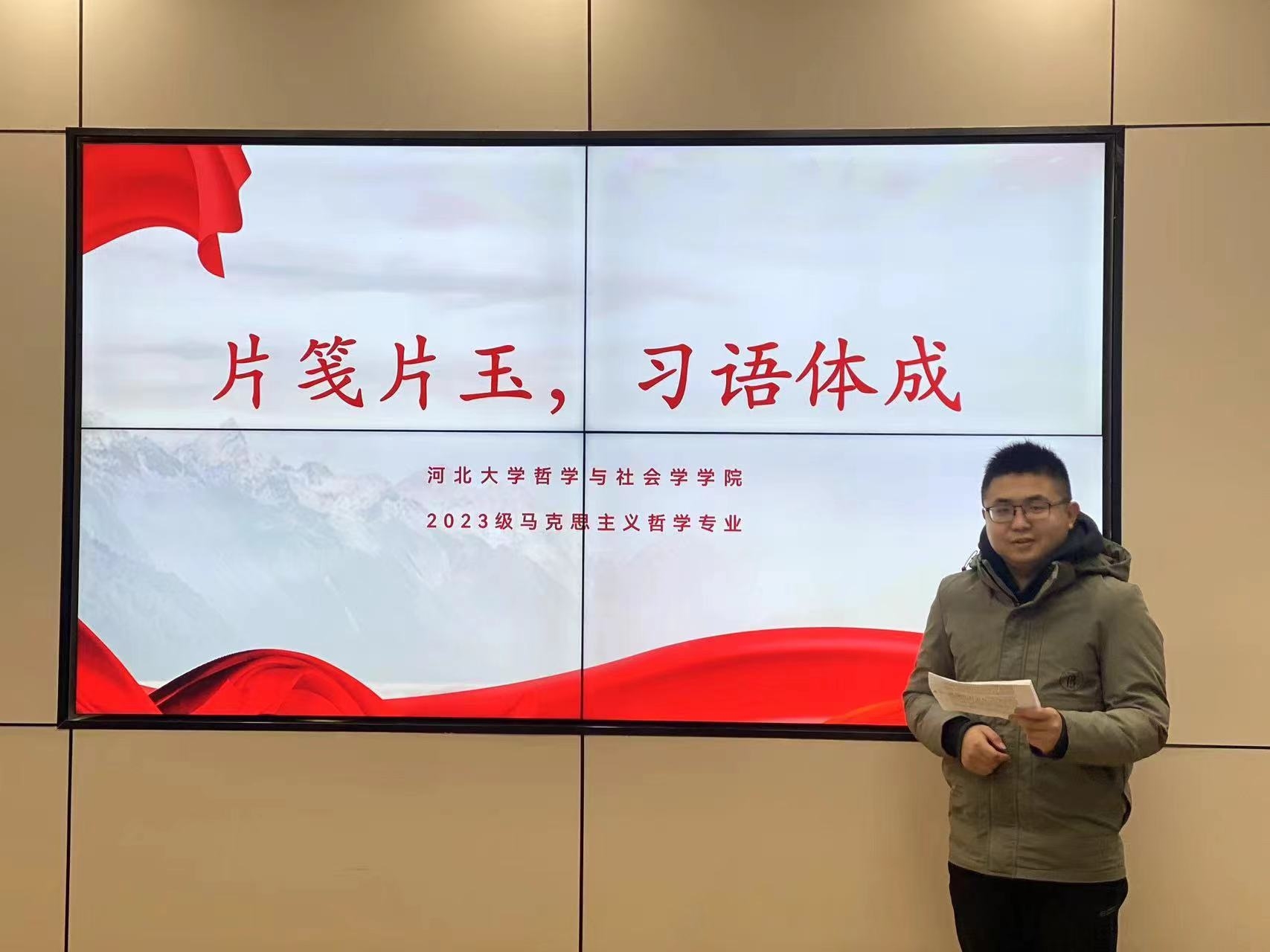 12月21日,学院团委在B4文科实验室,举办了“片笺片玉,习语体成”宣讲会。本次宣讲会由马克思主义哲学专业8名同学担任主讲,学院团委书记王昭、学院师生代表参与了本次活动。