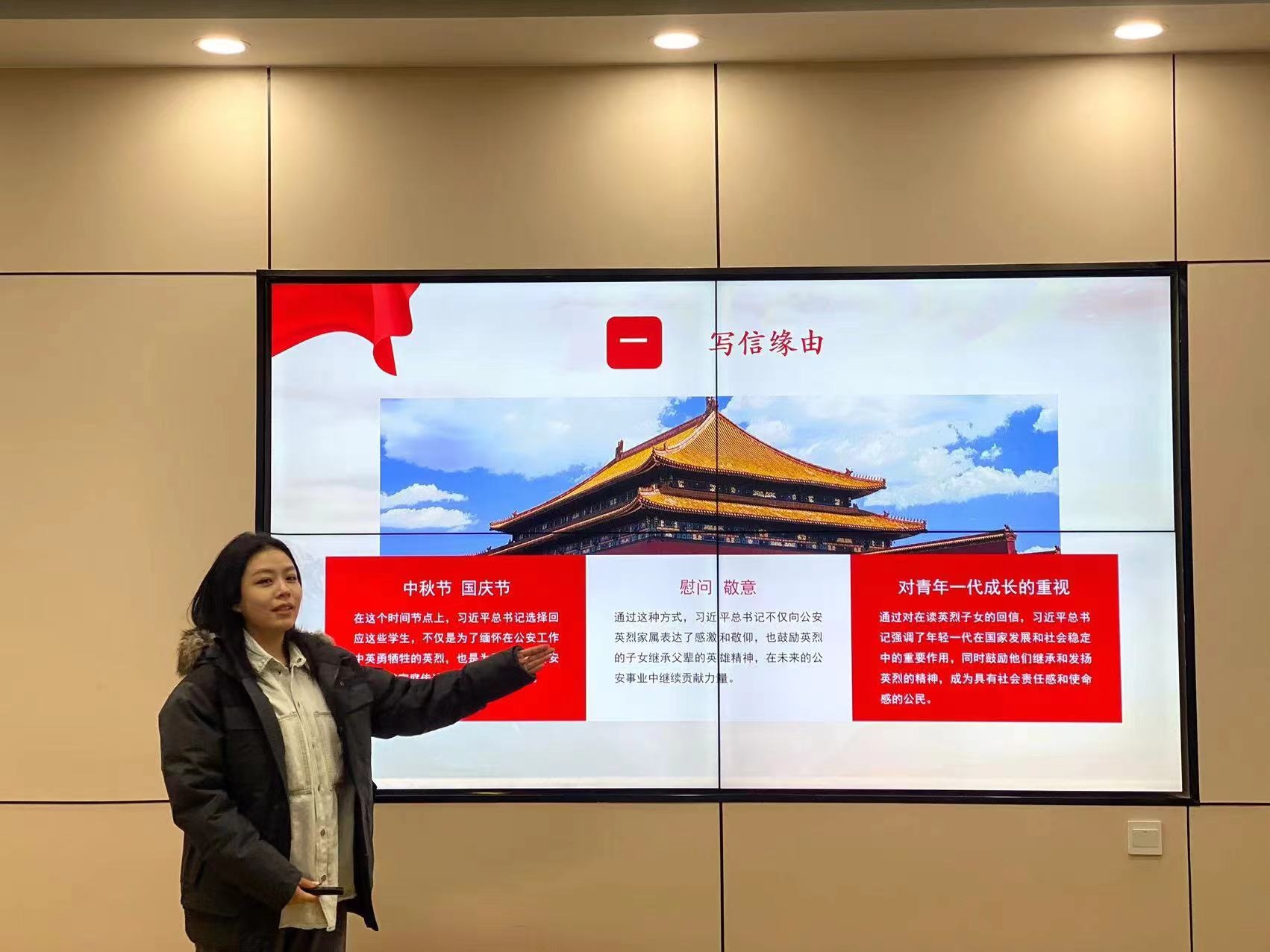 刘宇菲与姜晓雪同学介绍了“习近平总书记给中国人民公安大学在读英烈子女的回信”。总书记的回信充满着对公安英烈家属关心关怀,让广大公安民警士气振奋、斗志昂扬。两位同学从弘扬英雄文化,重视国家与社会安全,人才培养和增强社会凝聚力几个方面对回信精神进行了解读,号召同学们继承英烈遗志续写英雄荣光。
