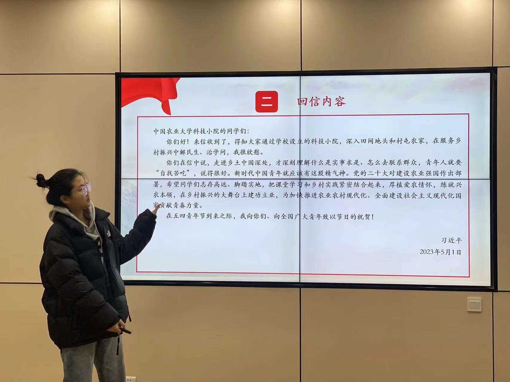 闫雨涵与付佳琪介绍了“习近平给中国农业大学科技小院的同学们的回信”。总书记信中指出新时代中国青年就应该有“自找苦吃”的精气神。两位同学通过对于回信的解读,借中国农业大学科技小院同学们的优秀事迹,阐发了青年响应国家号召,贡献青春力量的时代强音,并号召同学们志存高远、脚踏实地,把课堂学习和社会实践紧密结合起来,厚植爱国情怀,打好专业基础,练就兴国本领,在学习工作中奋发作为。