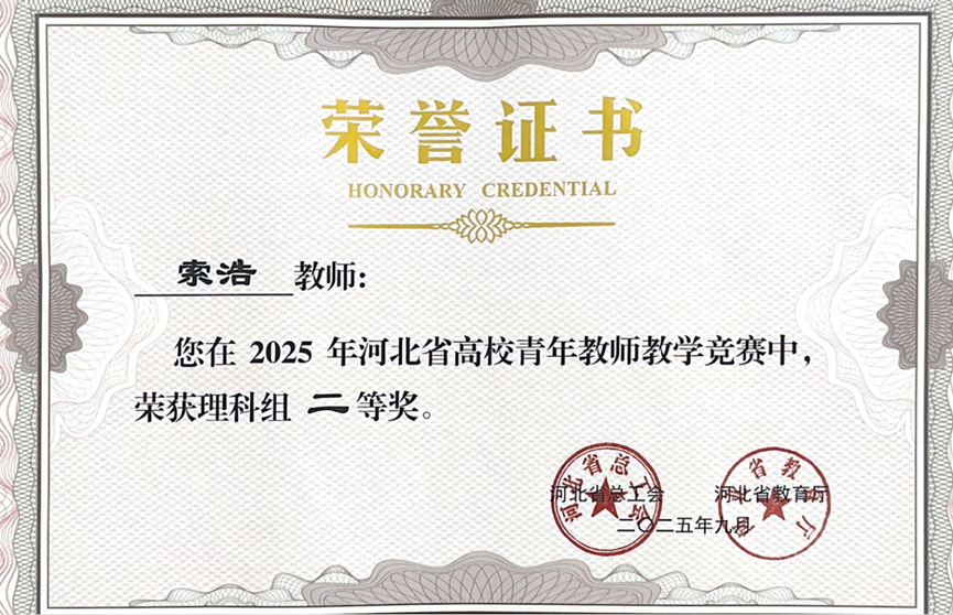 9月27日至30日,河北省总工会、河北省教育厅联合主办的“2025年河北省高校青年教师教学竞赛”决赛在石家庄举行。本次竞赛共有来自全省11个地市和28所高校的39个代表队,共139名选手参加。我院教师索浩在此次竞赛中获得理科组二等奖。