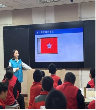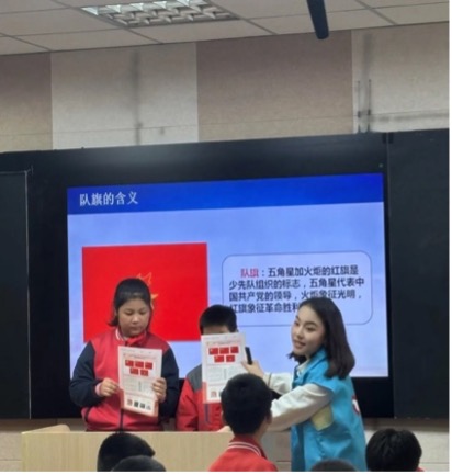 首期课程以“祖国旗帜在我心中”为主题,通过思想引领,点燃孩子们心中的爱国情怀与安全意识。在课堂上,志愿者通过细腻的讲解与生动的展示,引领孩子们穿过一扇扇由党旗、国旗、军旗、团旗、队旗构成的历史与文化之门。