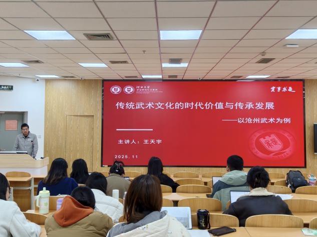 此外,“求是” 研究生宣讲团王天宇同学作为校研会特色宣讲力量的代表,为在场校院研会成员带来“沧州武术文化的时代价值与传承”主题分享。他从沧州武术历史渊源切入,结合霍元甲等武术名家的励志事迹,深入剖析其中蕴含的“身心一元”智慧与“自强不息”精神,并针对传承挑战提出发展路径。宣讲中,他通过“八极拳摘杏”等生动案例,既展现中华优秀传统文化的魅力,更启发校院研会成员探索跨界融合新形式,为后续开展特色活动提供了新颖思路和创作灵感,助力校研会丰富服务载体、拓宽思想引领维度。