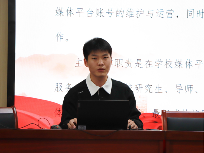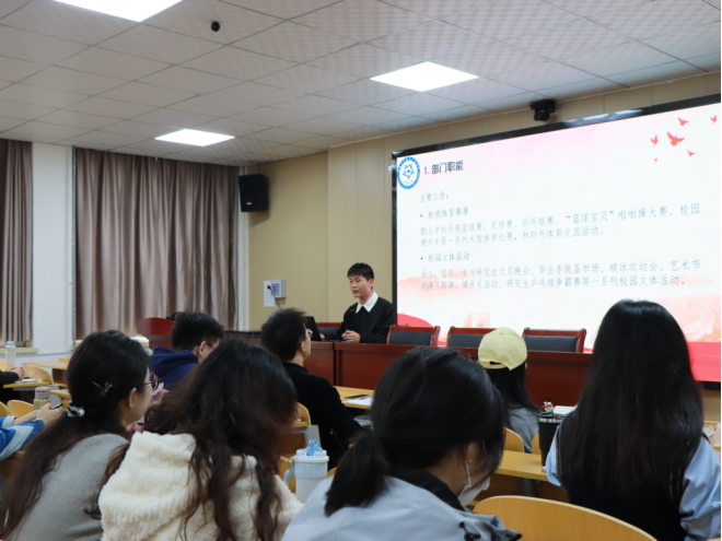 讲解结束后,学校研究生发展中心艺术团主持部干事张振康围绕校研会、研究生发展中心及宣讲团的职能定位与工作亮点展开系统讲解。他凭借清晰的逻辑与生动的阐述,层层拆解各部门运作学校机制,凸显各部门各司其职、协同发力,共同构建服务研究生综合平台的工作格局。