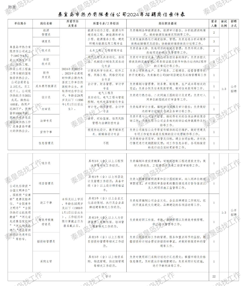 2.学历等要求详见《秦皇岛市热力有限责任公司2024年招聘岗位条件表》(附表);