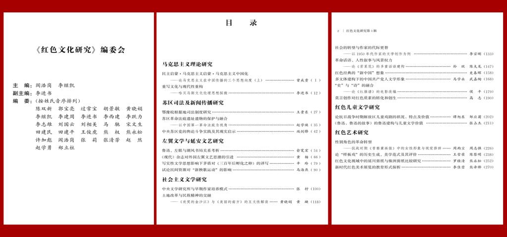 《红色文化研究》创办于2022年,原为年刊,从今年起改为半年刊,是红色文化研究类的综合性集刊。常设栏目有马克思主义理论研究、红色新闻传播研究、左翼文艺研究、解放区文艺研究、新中国红色文学研究、新时代文学研究、红色文化传承与教育研究、红色儿童文学研究、红色艺术研究等。